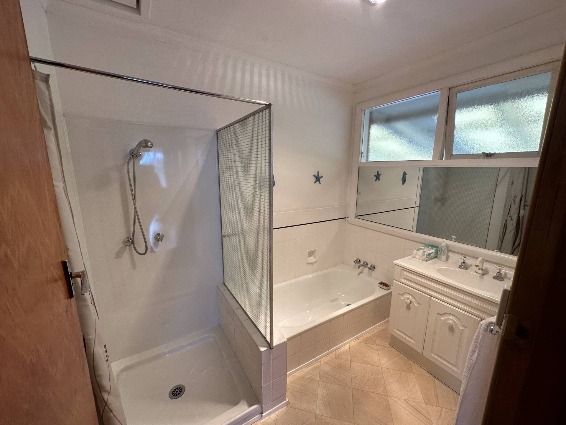 • A functional, fairly modern bathroom with sep. bath and shower